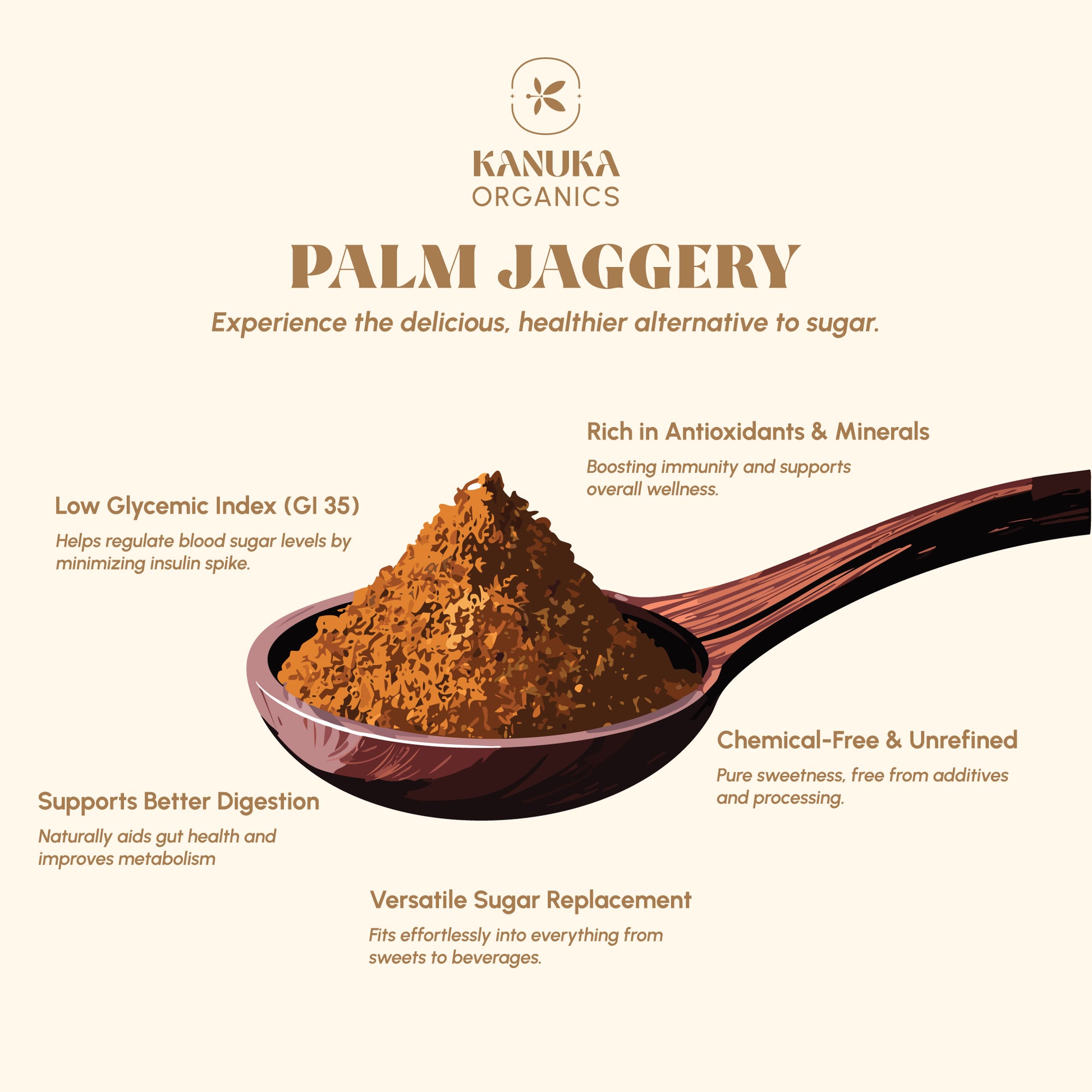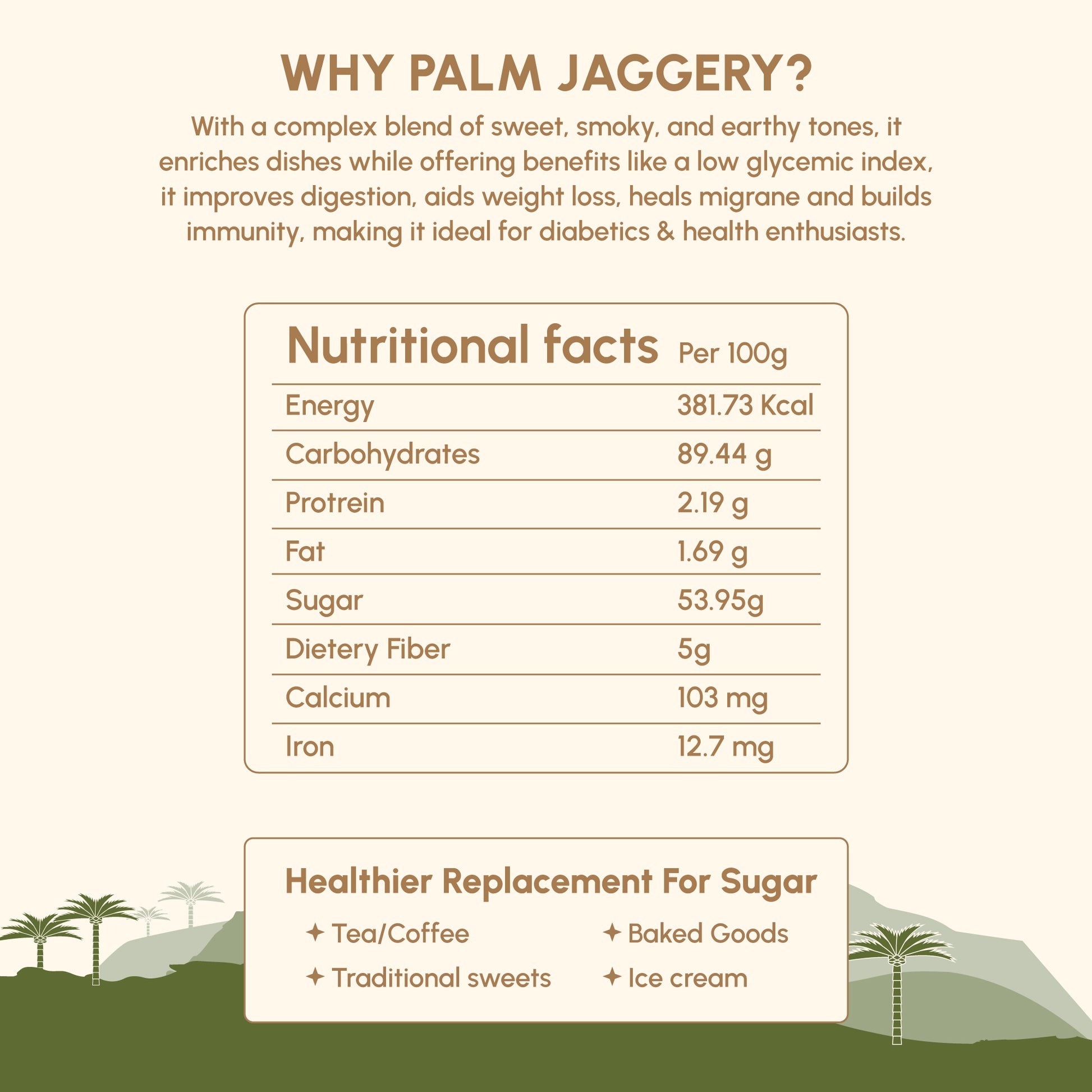 Discover the delicious and nutritious benefits of Palm Jaggery - Powdered (350 gms). Made from pure palm sap, this natural sweetener is high in iron, calcium, and other essential minerals. With its fine powdered form, it's perfect for adding a touch of sweetness to your baked goods, beverages, and more.